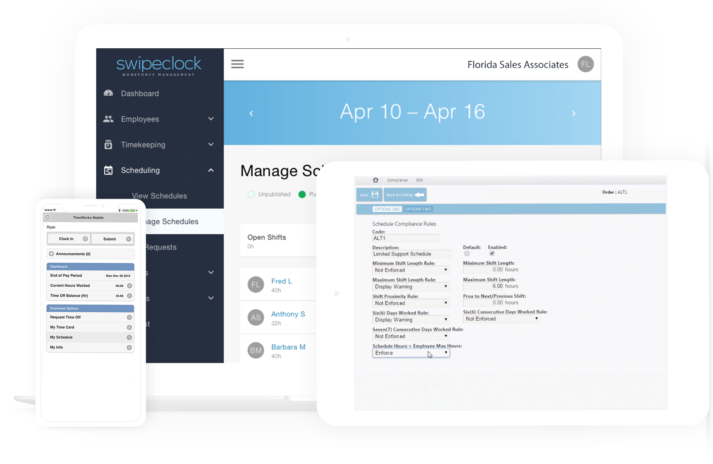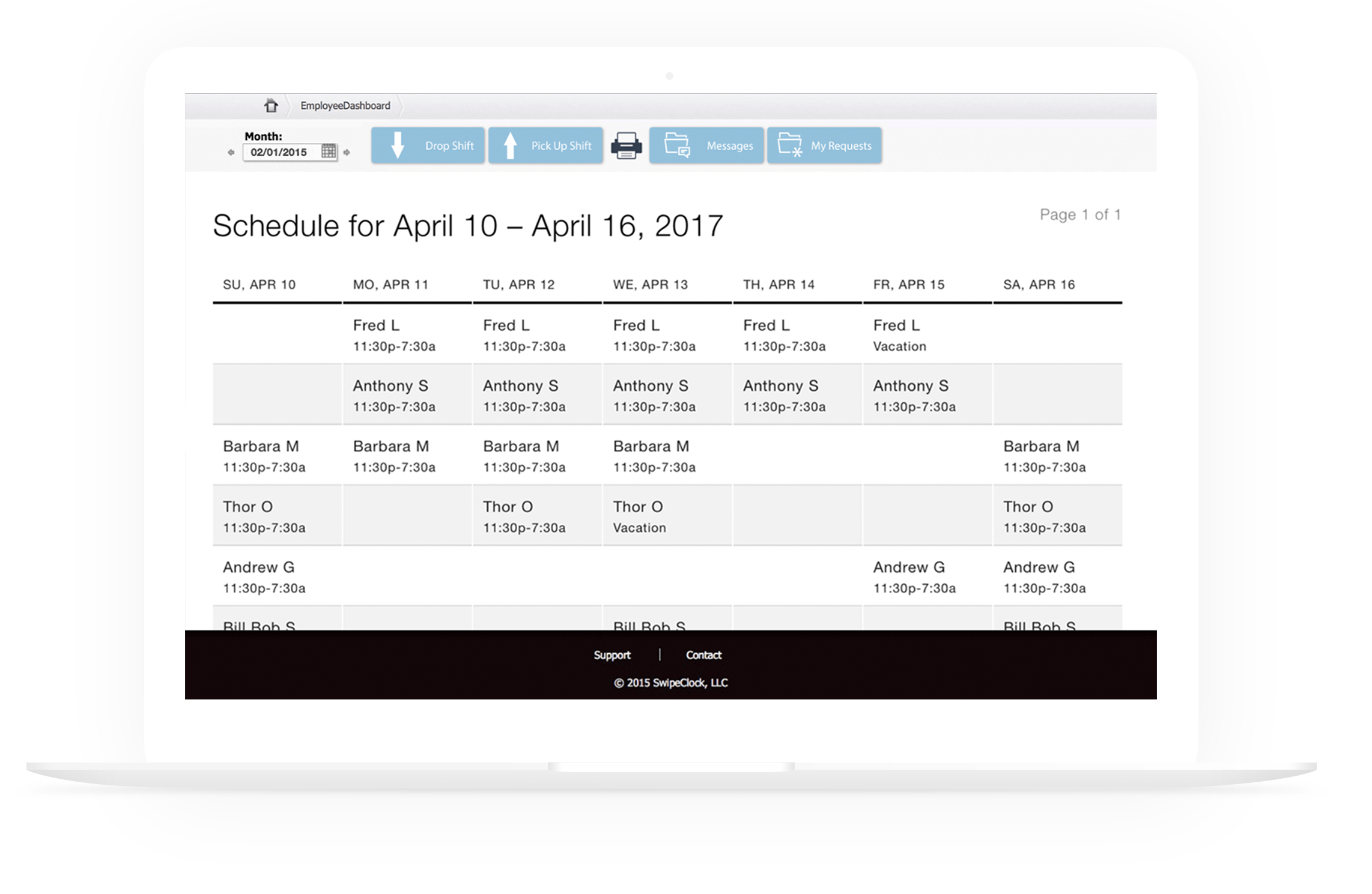 Employee access to self-service portal for schedules, reminders, shift trade boards, time cards, time-off requests and PTO balances